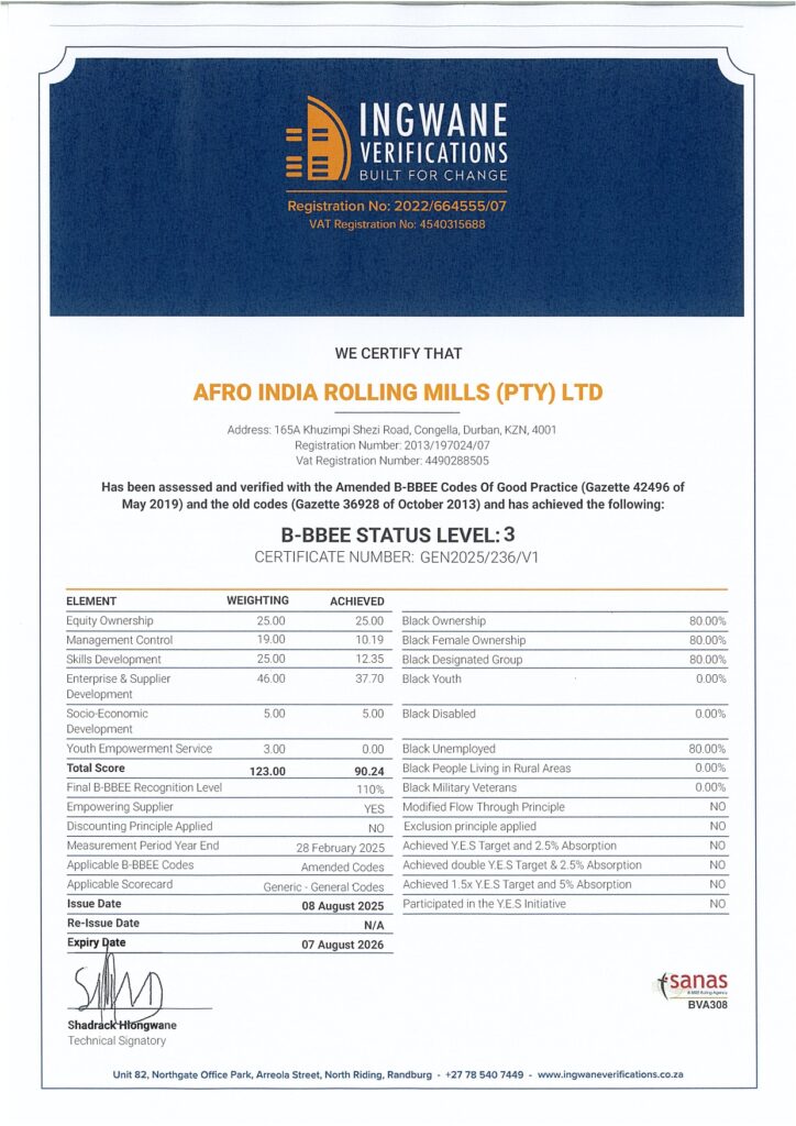 Afro India Rolling Mills is proud to be a Level 4 B-BBEE contributor, demonstrating our strong commitment to economic transformation and inclusive growth in South Africa. This accreditation highlights our dedication to fostering diversity and creating sustainable opportunities for empowerment in the communities we serve.