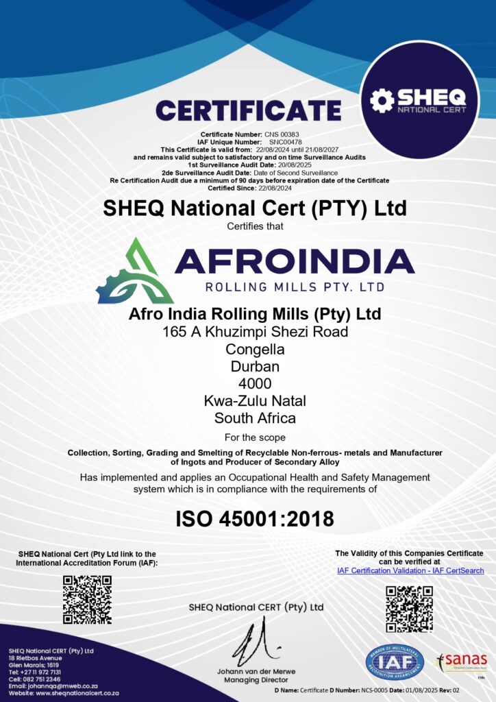Afro India Rolling Mills’ ISO 45001 certification reinforces our focus on creating a safe and healthy work environment for all employees. By adhering to this internationally recognized standard, we prioritize the well-being of our workforce, continuously mitigating risks and promoting a culture of safety at every level of our operations.
